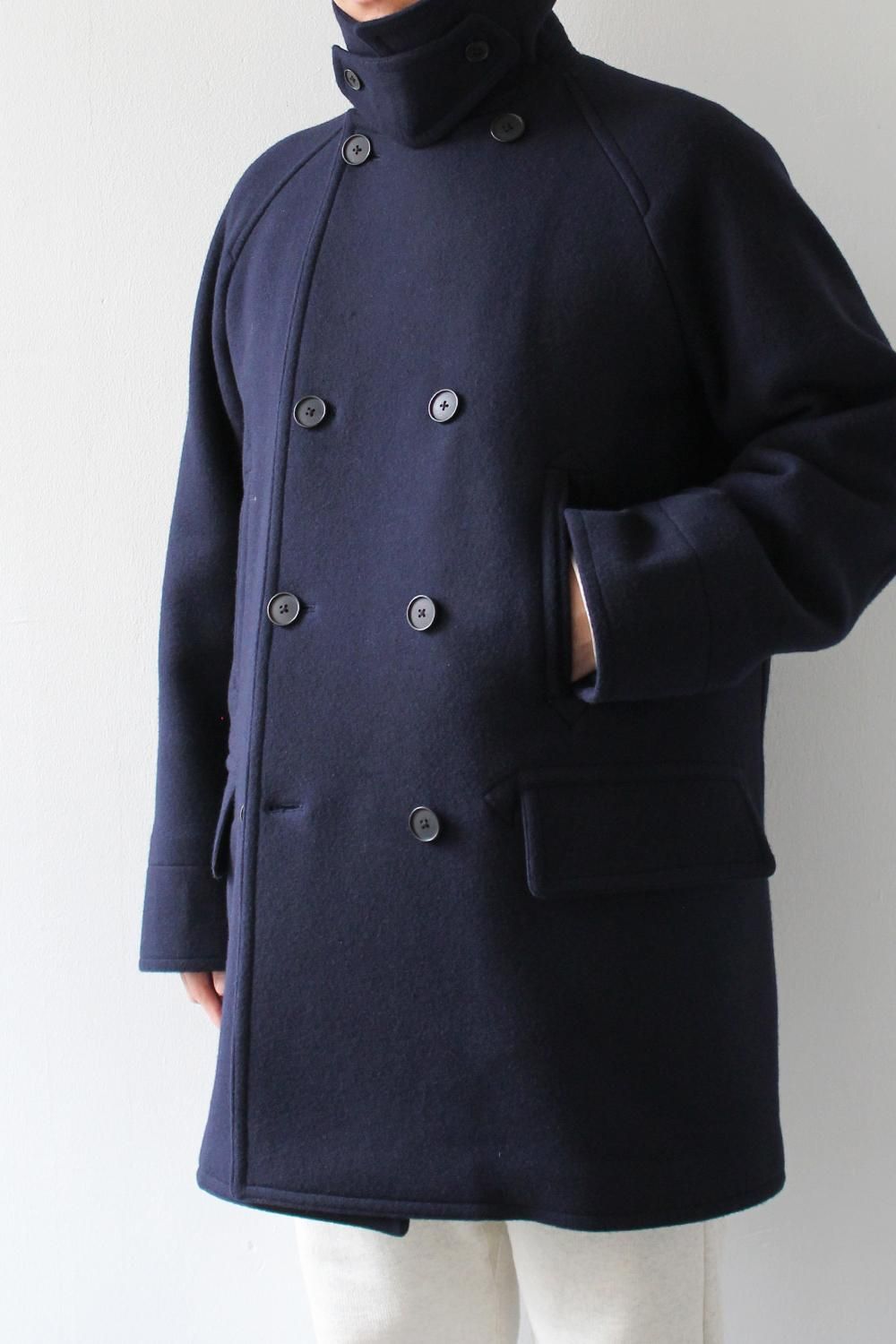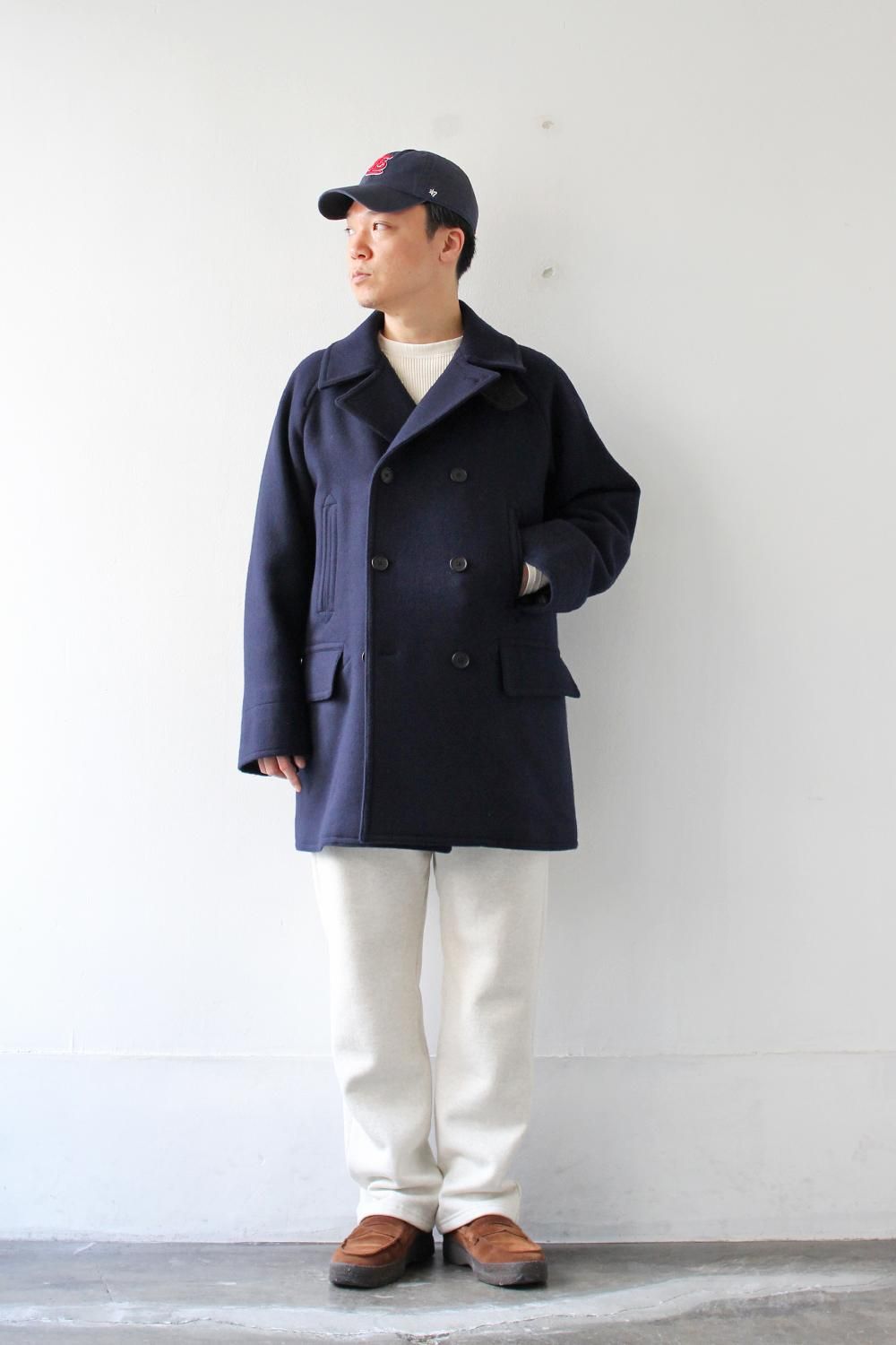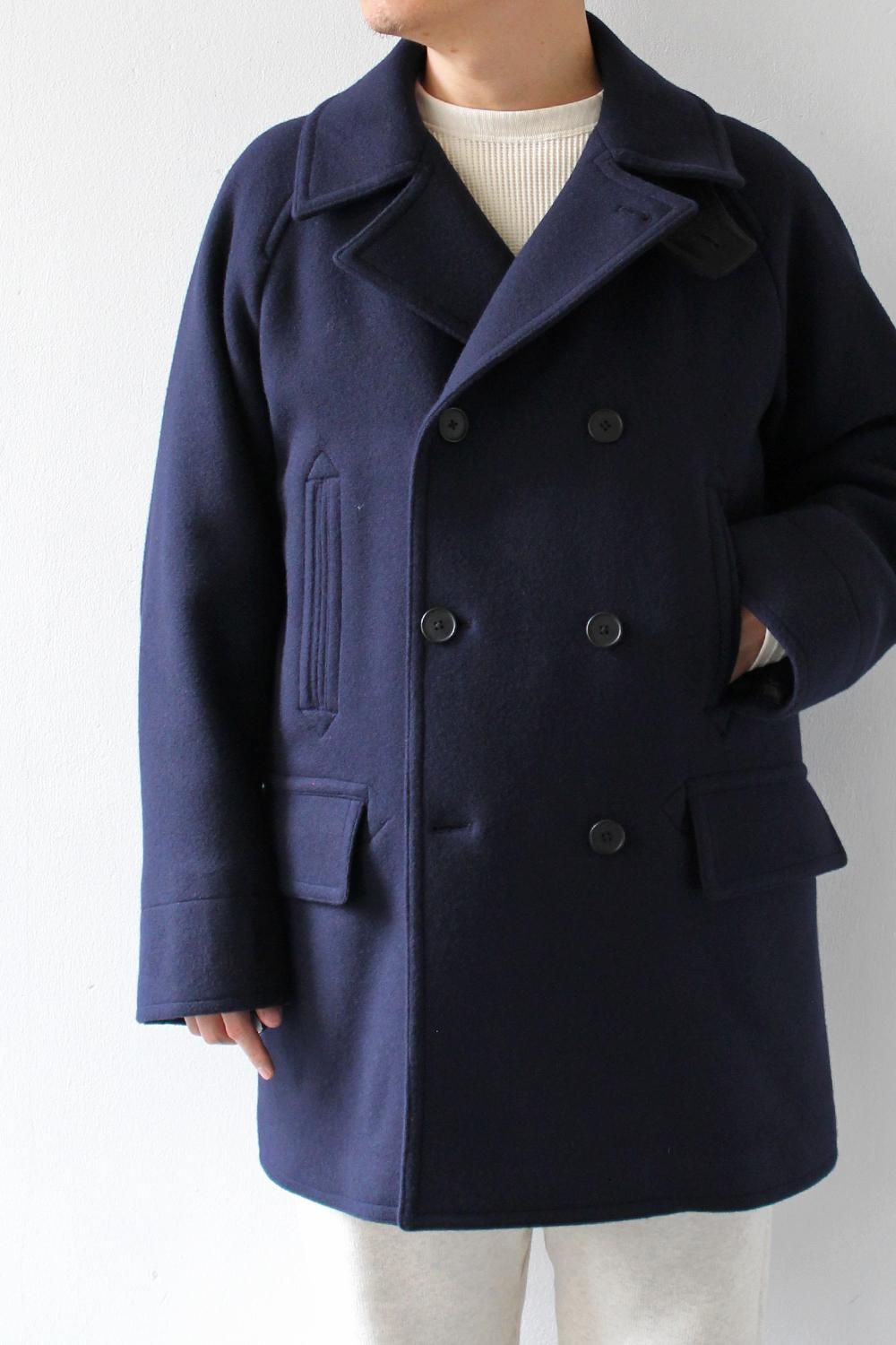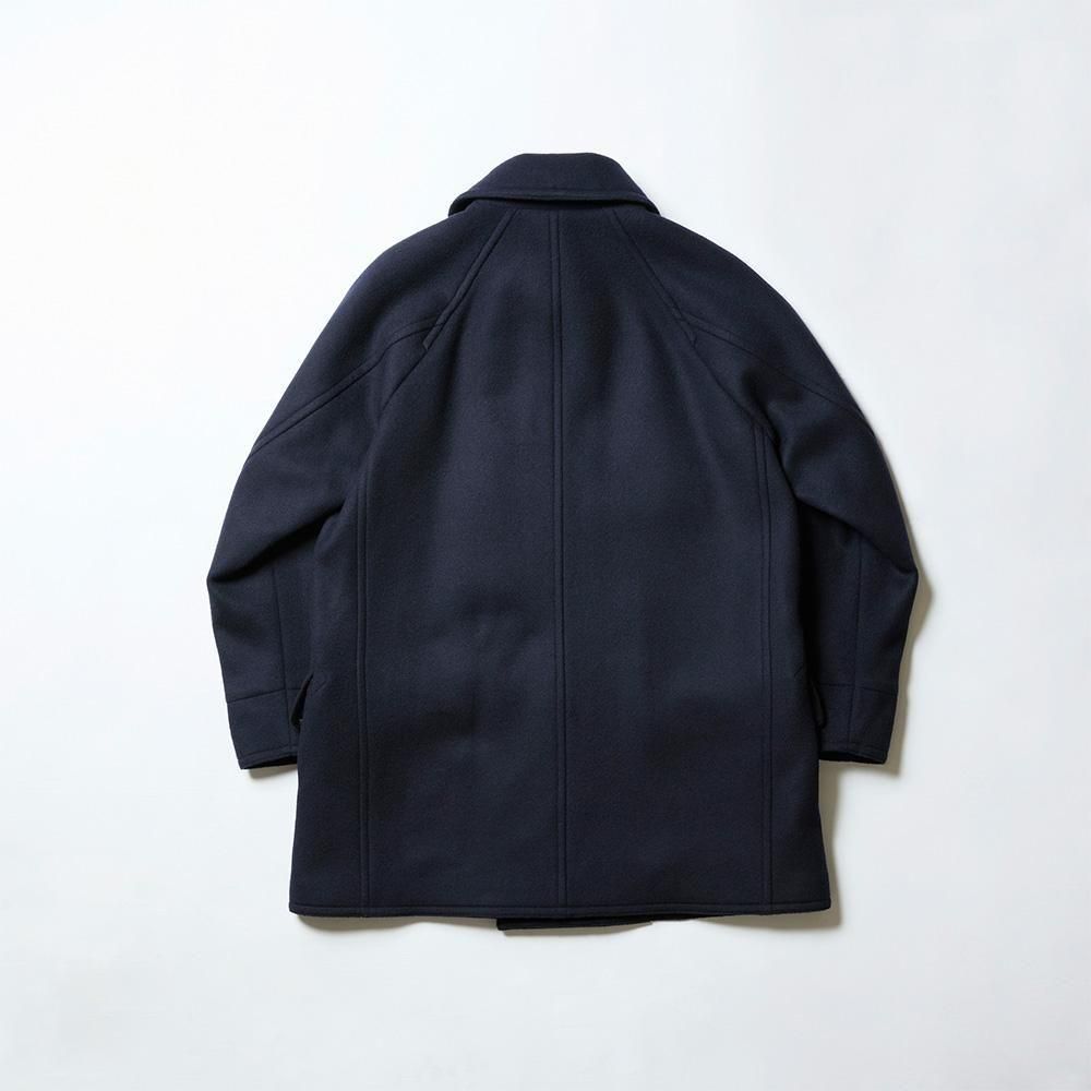袖付けをラグランに変更することで、Pコート特有の堅苦しさを感じさせない丸みのある表情になっています。