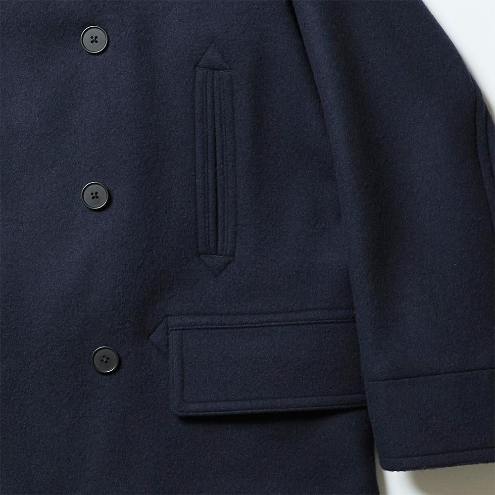 1900年代初頭のUS海軍の士官コートをデザインソースに、手の入れやすさを考慮した位置に配したハンドウォーマーポケットと、フラップ付きの腰ポケットが付く4ポケット仕様。